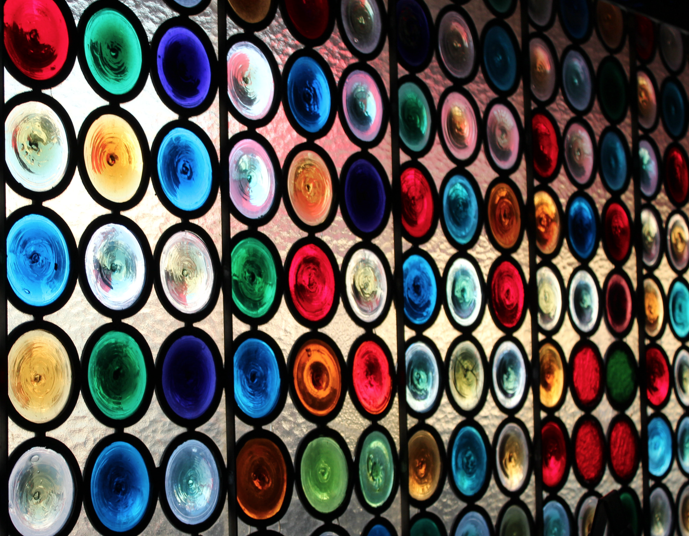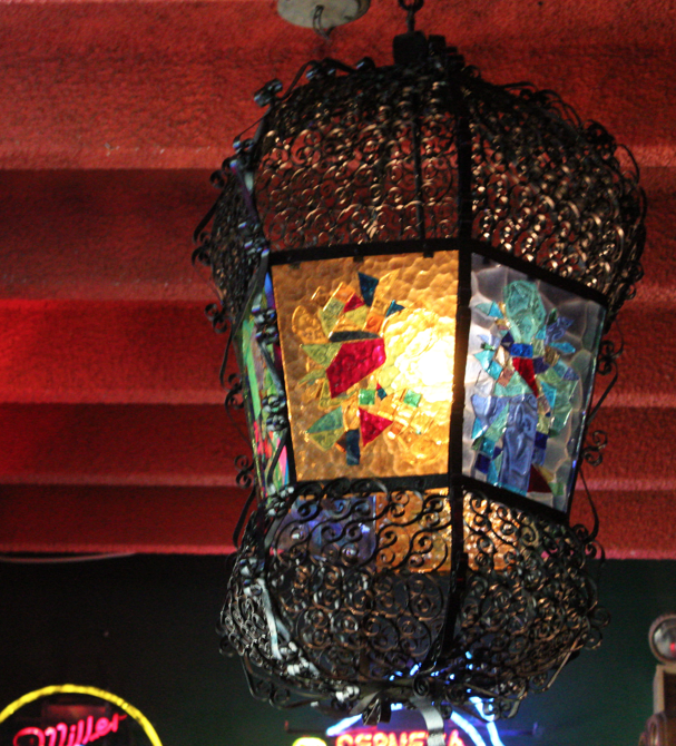 Colored glass bottles lined the walls, providing just enough light to make our way to the worn red booth.